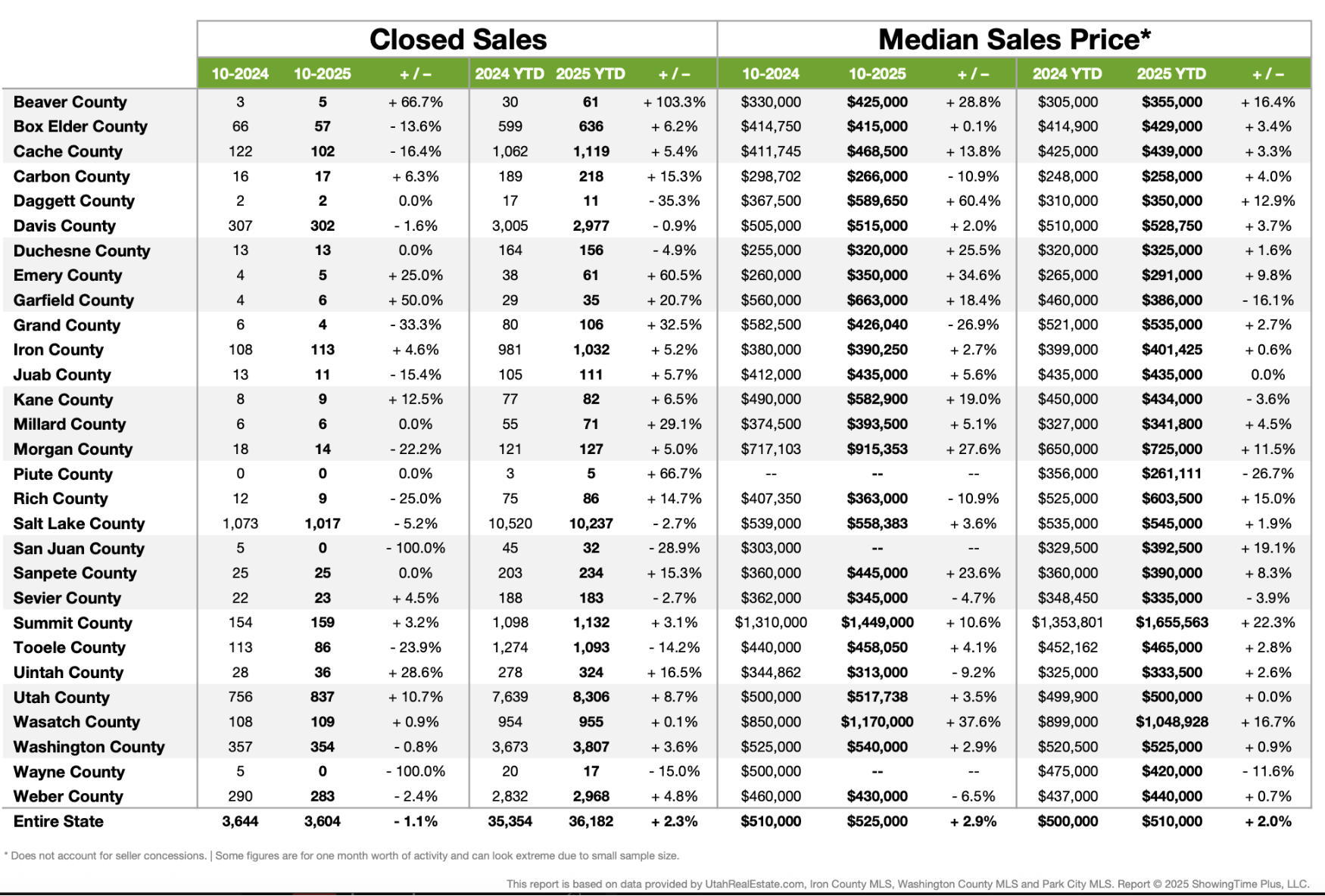 Utah’s market held steady this month with only a –1.1% dip in closed sales statewide, while median sales prices climbed +2.9% year over year.